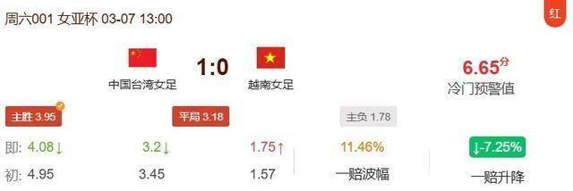 今日早场赛事再显冷门预警功力,中国台湾女足1-0力克越南女足,成功打出高赔主胜。赛前数据普遍看衰主队,越南女足取胜赔率低至1.78,而主胜赔率则高达3.95。冷门预警工具精准捕捉到这一潜在冷门,成功命中3.95倍的高赔主胜,用实战成绩再次证明其参考价值。